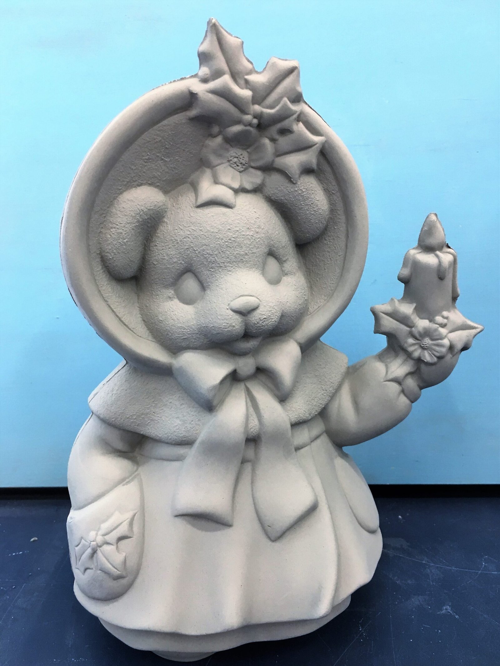 Item Number CM-16. The size is approximately 9.5″ high by 7″ long. The price listed is for Bisque (white ceramics) so you can paint your own. Please contact us for the price of the Painted Art.