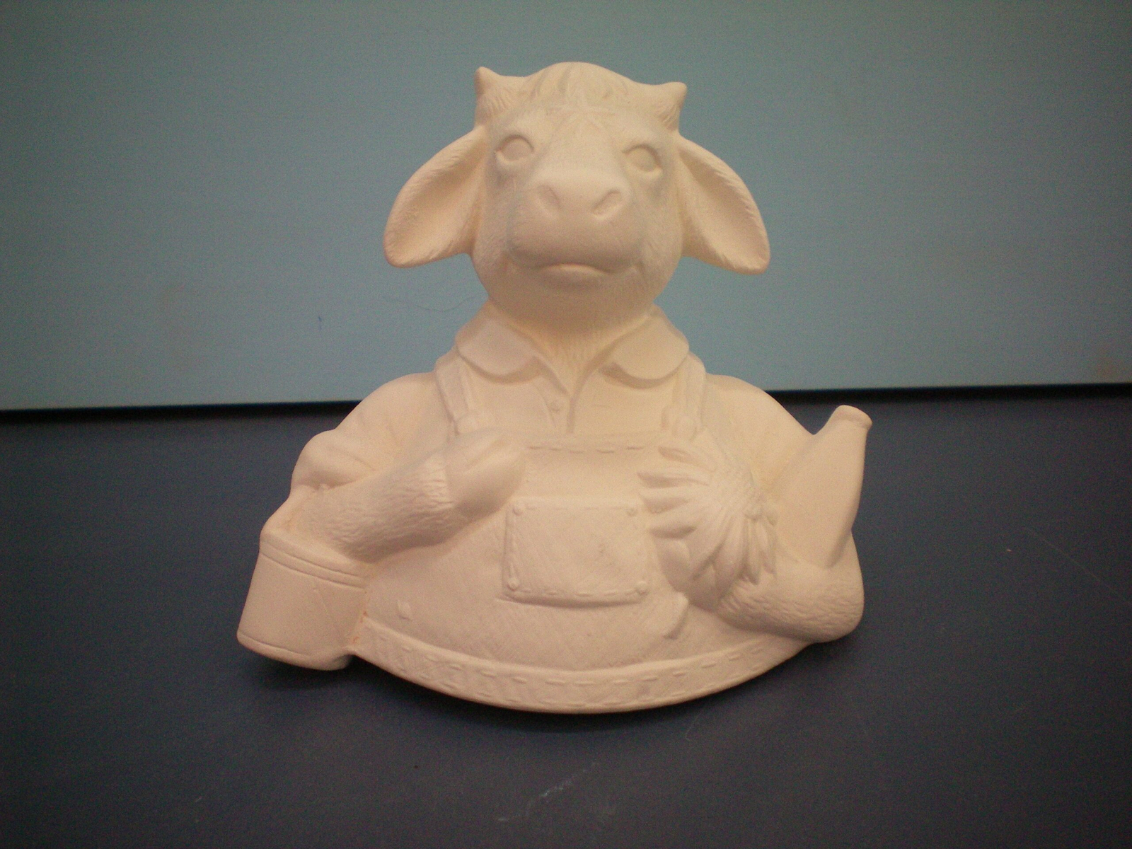 Item Number is COW-20. The size is approximately 5″ high by 5.5″ long. The price listed is for Bisque (white ceramics) so you can paint your own. Pleae contact us for the price of the Painted Art.
