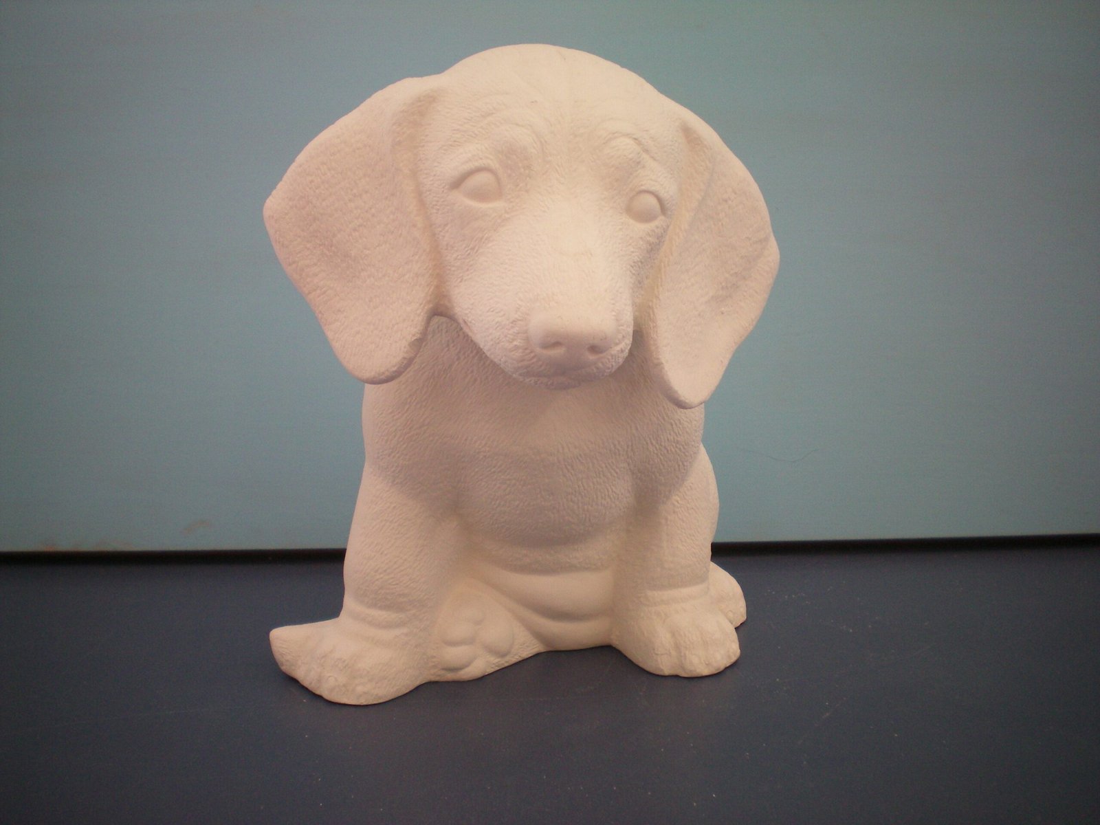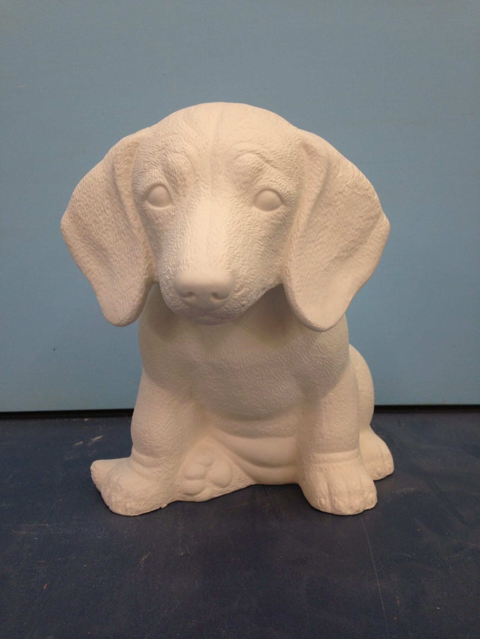 Item Number is DOG-11. The size is approximately 7.5″ high by 6.5″ long. The price listed is for Bisque (white ceramics) so you can paint your own. Please contact us for the price of the Painted Art.