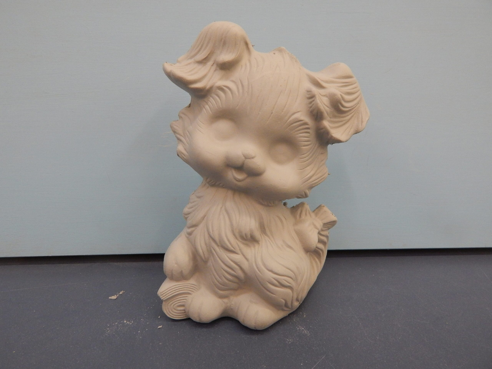 Item Number DOG-53. The size is approximately 5.5″ high by 4.5″ long. The price listed is for Bisque (white ceramics) so you can paint your own. Please contact us for the price of the Painted Art.