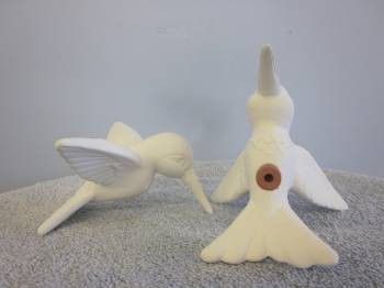 Item Number BIR-23. These adorable birds are put on a metal doll rod (not included, but can be purchased at any home improvement store) so they appear to be flying in the air. The size is approximately 5″ high by 5″ long.The price listed is for Bisque (white ceramics) so you can paint your own. Please contact us for the price of the Painted Art.